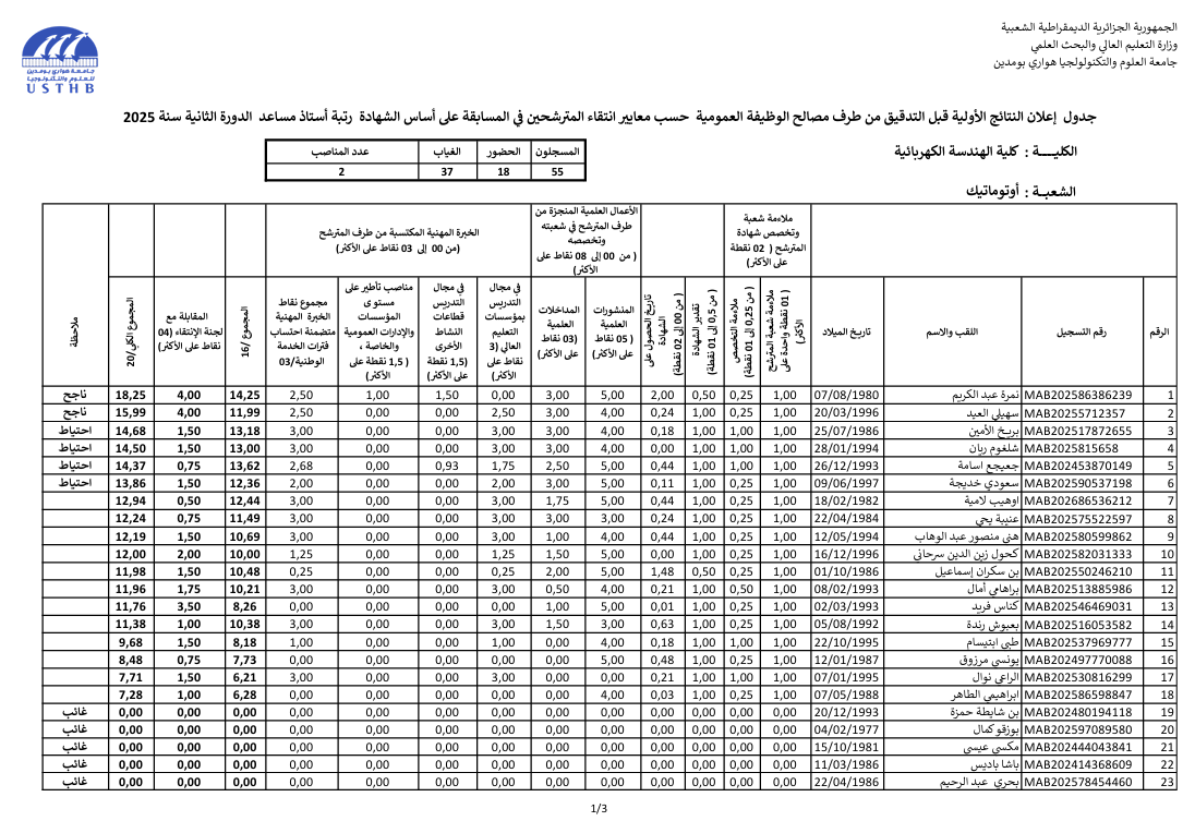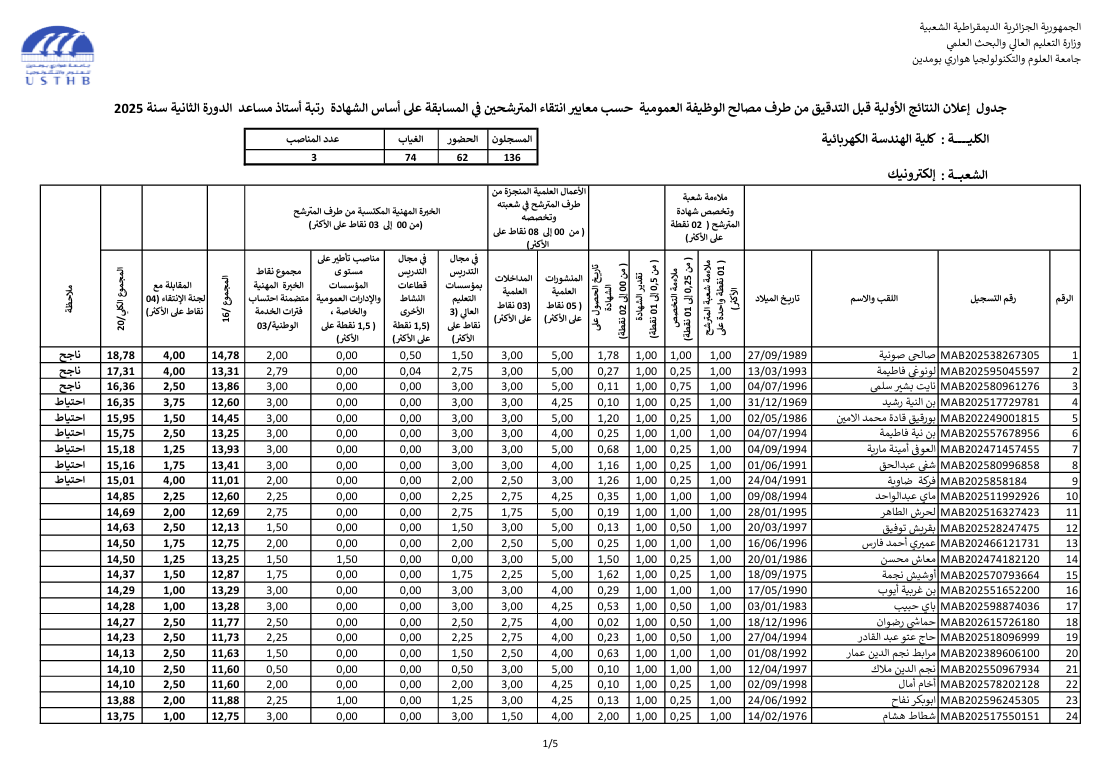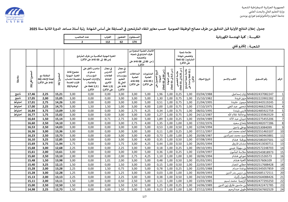 preliminary results recruitment assistant professor 2025 second session: electrical engineering